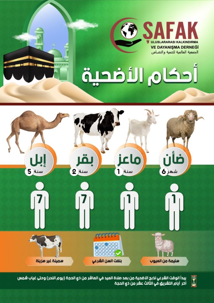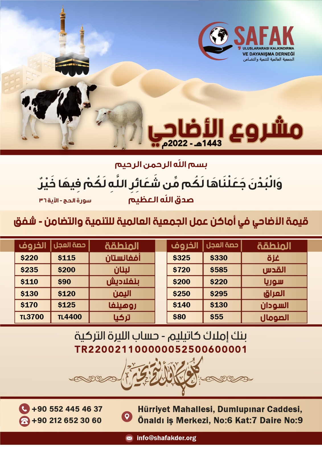 تستمر الجمعية العالمية للتنمية والتضامن – شفق – في استقبال أضاحيكم وهديكم طوال أيام عيد الاضحى المبارك حتى مغرب ثالث أيام العيد، في كافة أماكن عملها في 11 دولة ومنطقة، حيث توفر الأضاحي العجول والخراف المستوفاة للشروط الشرعية للأضحية. ويتم إرسال التوثيق الكامل للأضحية قبل وأثناء وبعد الذبح.